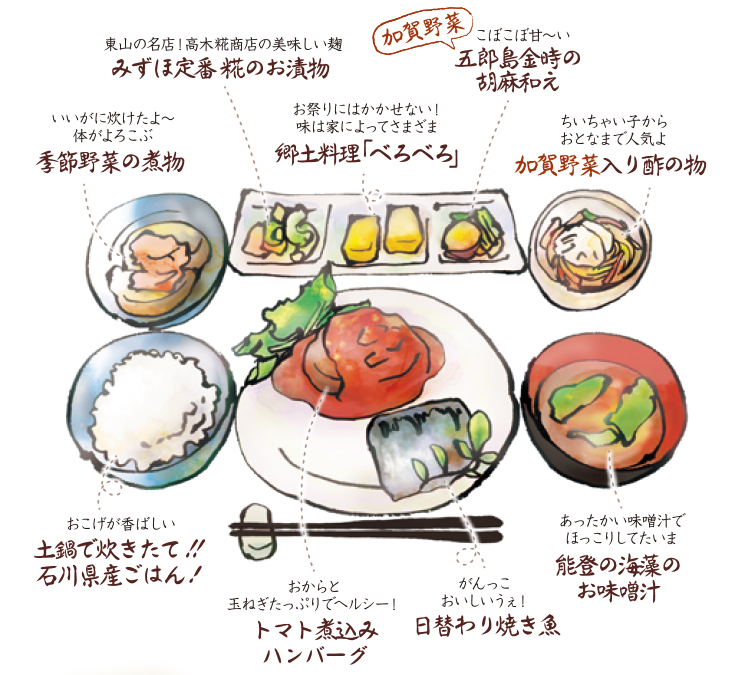 Select Ishikawa prefecture clay pot rice with choice side dishes followed by Noto vegetable pudding and an aftermeal drink.